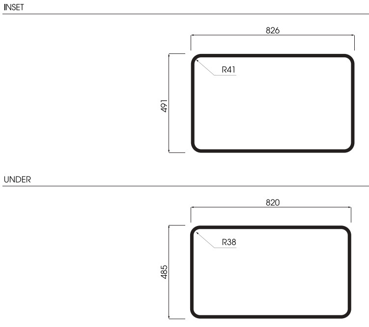 C(컷아웃사이즈): 820 x 485 x R38 (UNDER) / 826 x 491 x R41 (INSET)