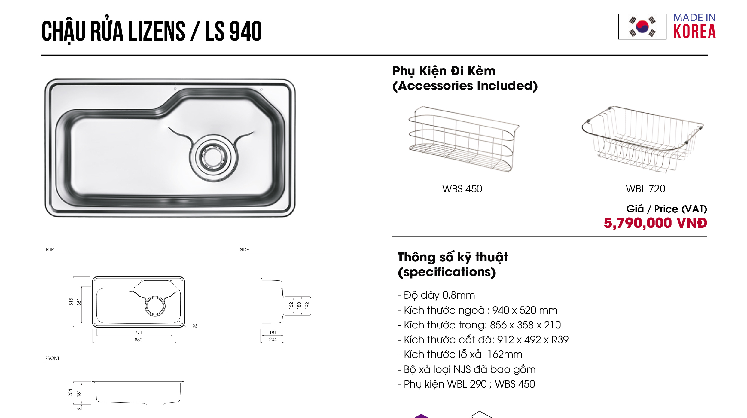 Chậu rửa chén LS 940 là thương hiệu số 1 tại Hàn Quốc. Với thiết kế sang trọng rộng rãi, cùng các rãnh uốn lượn mềm mại thoát nước nhanh chóng. Bon rua inox có kích thước to gần 1m phù hợp với gia đình sở hữu những căn bếp to, nhà hàng khách sạn quy mô nhỏ hoặc quán ăn gia đình. Bởi sản phẩm này như một chiếc bồn công nghiệp ở phân khúc giả tầm trung không quá cao không quá thấp. Sản phẩm của Lizens đã đáp ứng được các yêu cầu về chất lượng cũng như nhận được nhiều phản hồi tốt từ khách hàng đã sử dụng ở hơn 30 nước trên toàn thế giới.