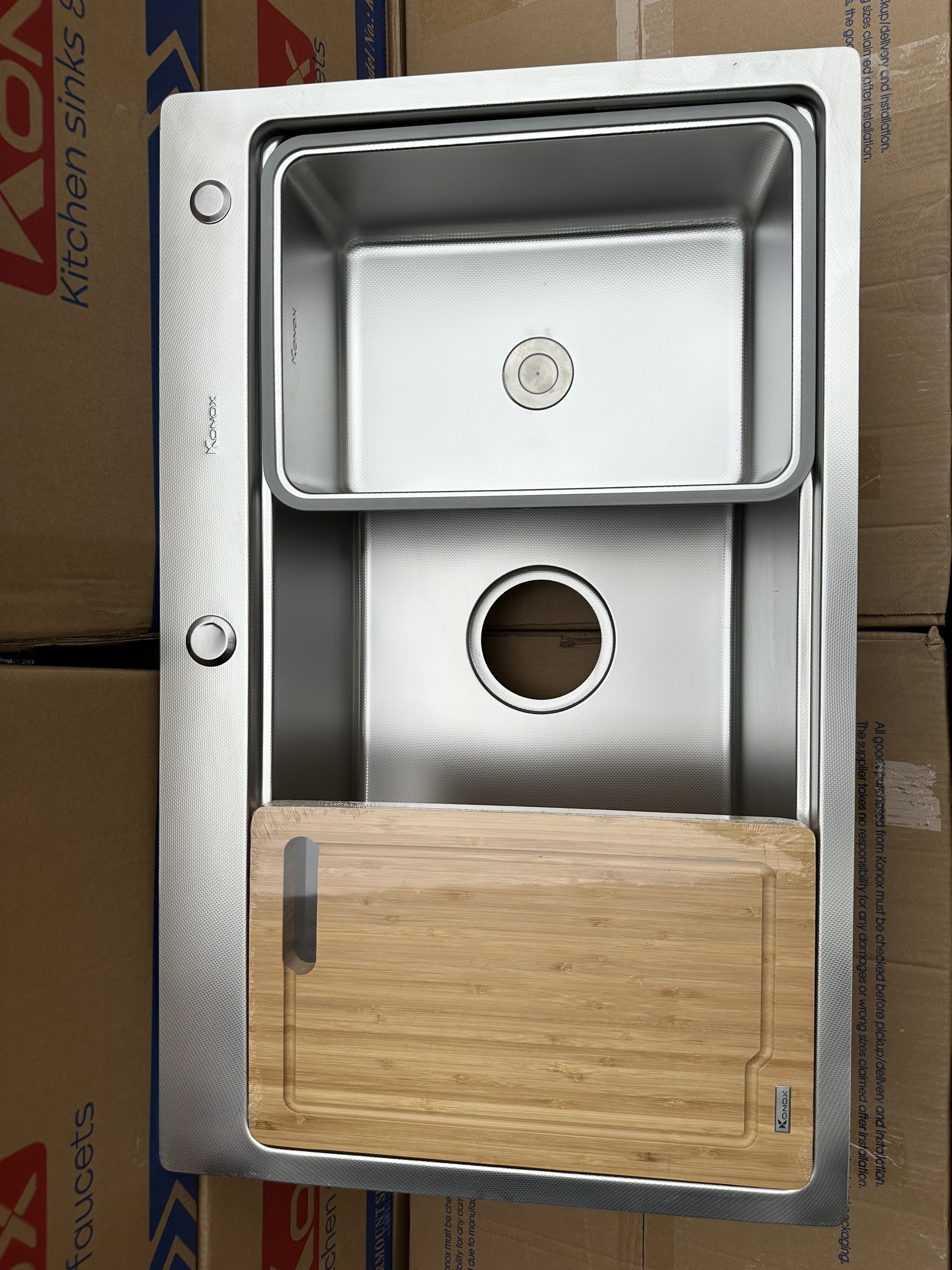 - Thiết kế hiện đại với gờ hạ bậc – tích hợp phụ kiện thông minh: Siphon, thớt inox, Colander