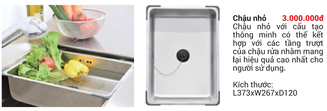 - Thiết kế thông minh và tối ưu không gian: Chậu được thiết kế ray trượt được tích hợp trong lòng chậu, để kết hợp với các phụ kiện, tăng thêm không gian bếp và đảm bảo sự tiện nghi cho người dùng.