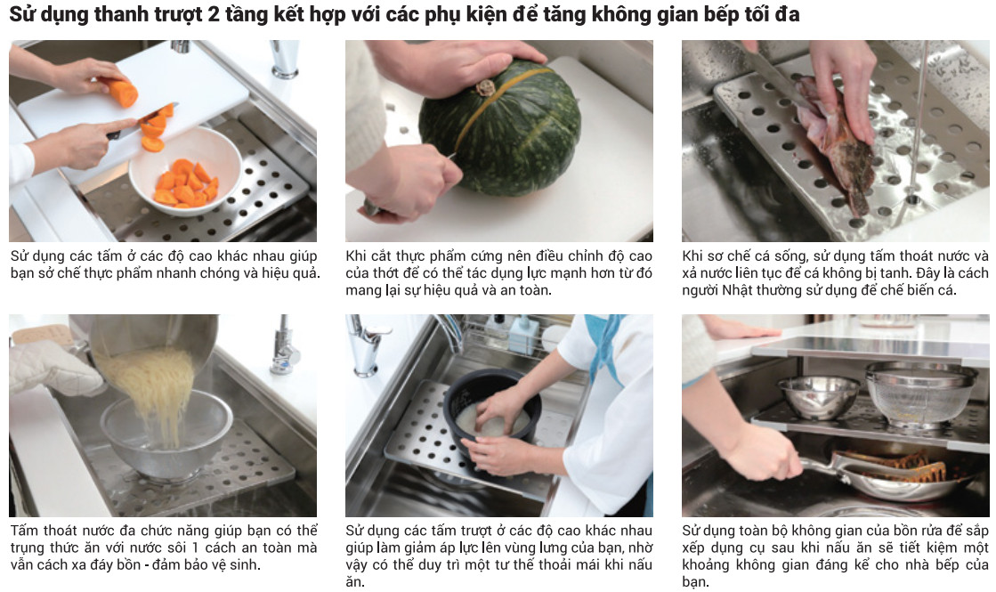 Công dụng: gác trên ray giúp làm cá, trụng mì trong lòng chậu không bị chảy tràn nước trên mặt bếp lại an toàn và vệ sinh vì cao hơn đáy chậu.
