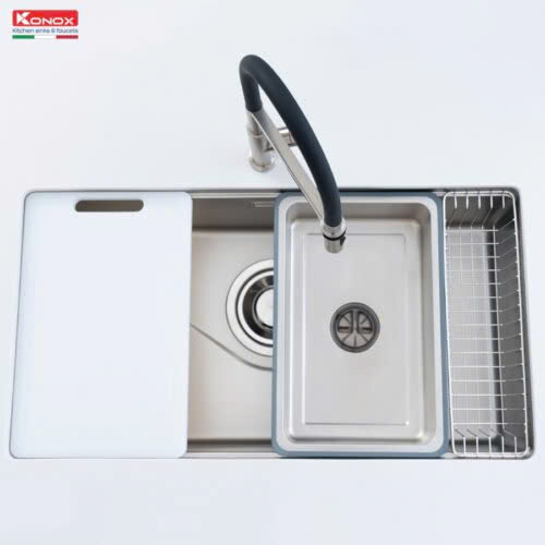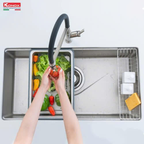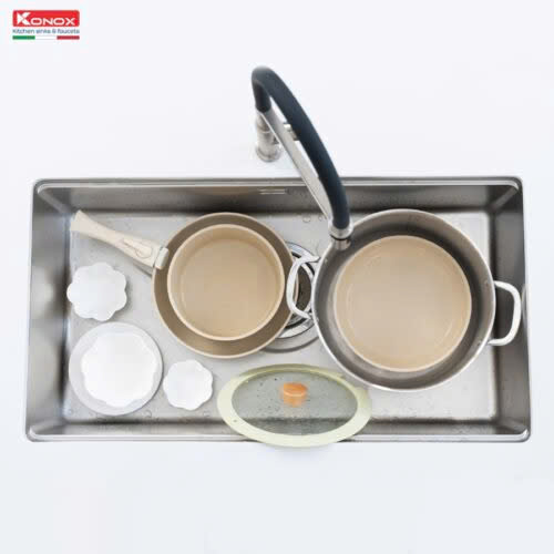 Konox trang bị thêm một chậu rửa nhỏ thiết kế theo kích thước bồn bếp để khách hàng trải nghiệm sơ chế đồ thuận lợi hơn khi nhu cầu rửa ít.ng.
