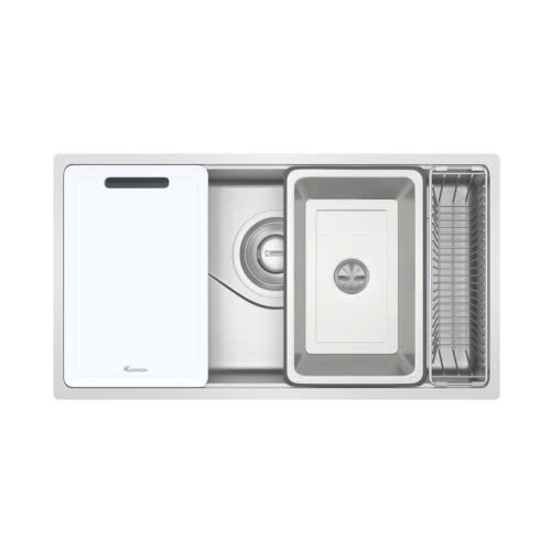 - Thiết kế hiện đại với gờ hạ bậc – tích hợp phụ kiện thông minh: Thớt nhựa, rổ phụ, chậu rửa nhỏ, Siphon