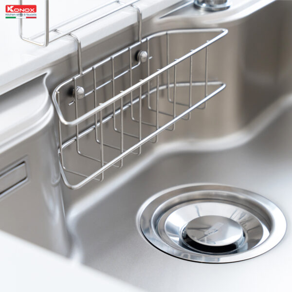 Rổ phụ chất liệu inox cao cấp. Sản phẩm gắn trên thành chậu, để đựng vật dụng chậu rửa như bùi nhùi, mút rửa bát, nước rửa bát