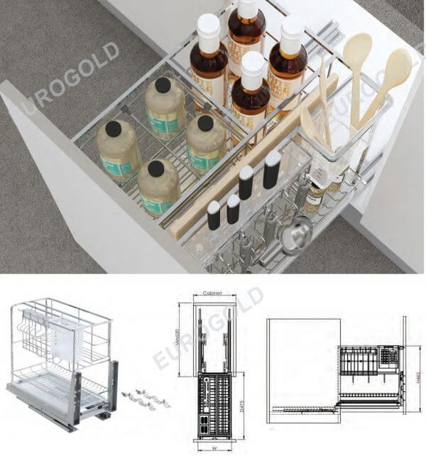 Kệ được thiết kế vuông vắn, tạo cảm giác chắc chắn và sang trọng. Với kích thước phù hợp, nó dễ dàng lắp đặt và tiết kiệm không gian trong nhà bếp.Sản phẩm được thiết kế 2 tầng với khả năng lưu trữ khá lớn, bạn có thể yên tâm để đựng những lọ gia vị có trọng lượng lớn. Với kệ gia vị Eurogold gian bếp của bạn sẽ trở nên khoa học hơn, thuận tiện cho việc sử dụng.