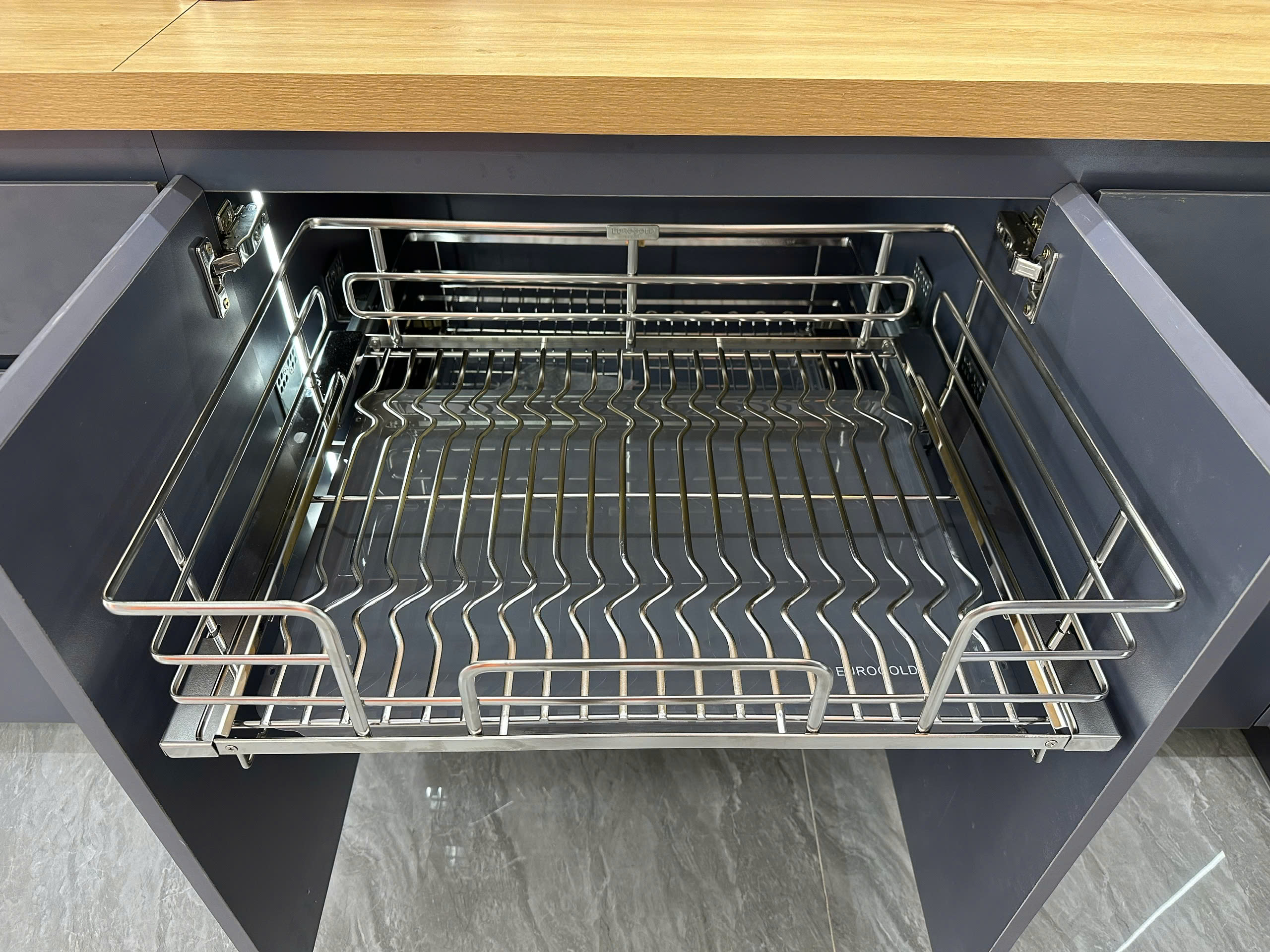 - Phụ kiện kèm theo: Ray âm giảm chấn (bắt đáy tủ), Bộ phụ kiện lắp cánh kéo, Khay hứng nước