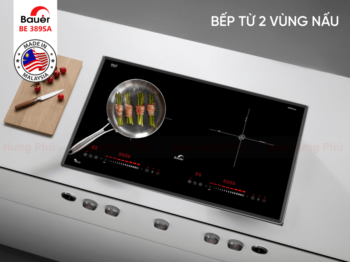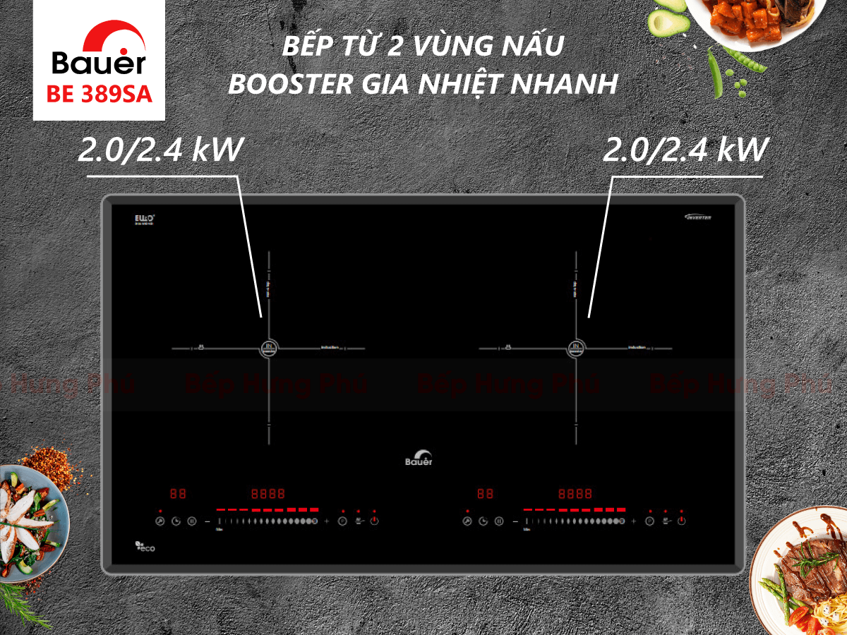 – Chế độ Booster là tính năng giúp bếp từ gia tăng nhiệt nhanh khi nấu, với mức công suất khi sử dụng booster sẽ vượt qua công suất định mức của bếp. Bếp từ BE 389SA gồm 2 lò từ với tổng công suất là 4800W, lò bên trái có công suất 2000W và có thể lên đến 2400W khi ở chế độ Booster. Lò bên phải cũng tương tự như vậy, có công suất 2000W và 2400W khi ở chế độ Booster. Lưu ý chỉ nên dùng chế độ Booster trong vòng 5-10 phút, tránh trường hợp quá tải.