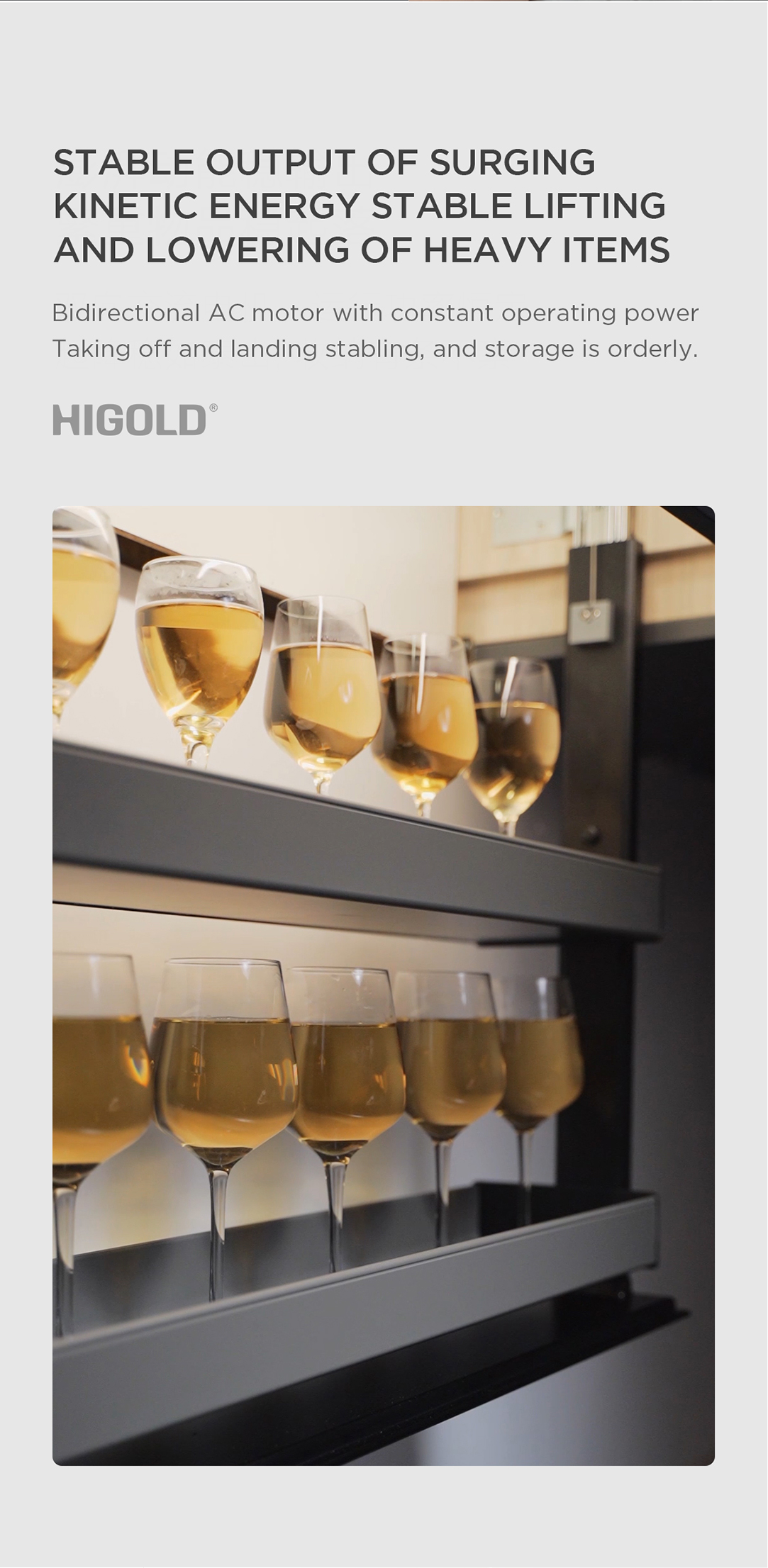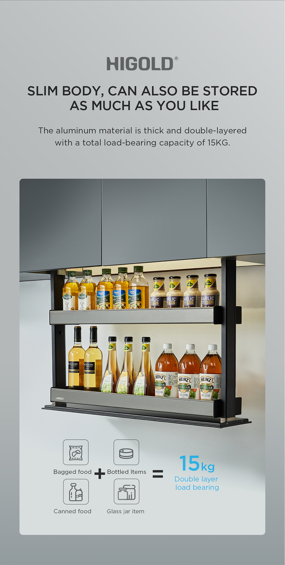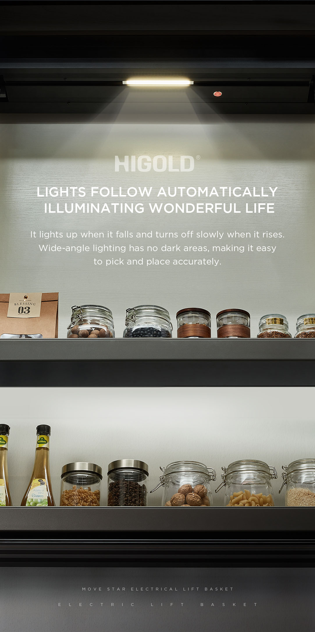 Giá nâng hạ điện tự động Higold 401352 | 700mm được thiết kế 2 tầng riêng biệt. Tầng trên để các lọ gia vị nhỏ, tầng dưới phù hợp cho các chai lớn hơn, giúp phân loại và sắp xếp gọn gàng, tận dụng hiệu quả không gian tủ bếp trên nơi thường khó với tới.