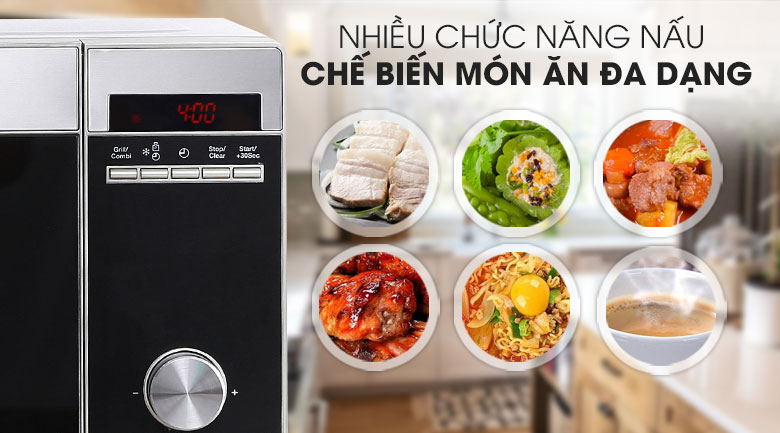 Gồm nấu, hâm nóng, rã đông theo trọng lượng, rã đông theo thời gian, nướng. Công suất vi sóng 800 W, công suất nướng tới 1000 W giúp làm chín thức ăn nhanh, ít tốn điện.