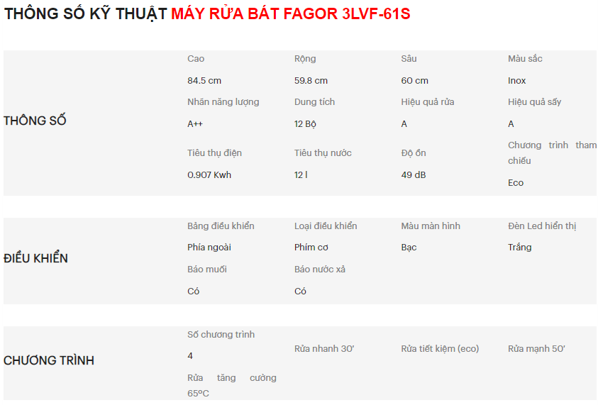 THÔNG SỐ KỸ THUẬT MÁY RỬA BÁT FAGOR 3LVF-61S