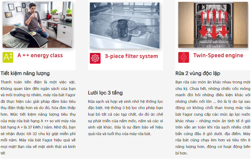 Rửa 2 vùng độc lậpBạn rửa các món ăn khác nhau trong một chu kỳ. Chưa hết, những chiếc cốc mỏng manh đòi hỏi những điều kiện khác với những chiếc nồi lớn … Đó là lý do tại sao động cơ không chổi than trong máy rửa bát Fagor cung cấp các mức áp lực nước khác nhau – những món ăn tinh tế ở giỏ trên vẫn an toàn khi rửa sạch nhiều chất bẩn cứng đầu ở giỏ dưới. địa điểm. Máy rửa bát cũng chạy êm hơn và tiêu tốn ít năng lượng hơn, động cơ hoạt động bền bỉ hơn. |