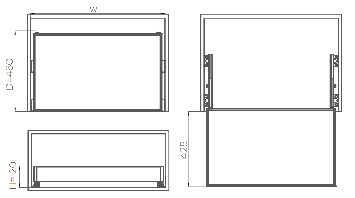 Mã sản phẩm | Rộng x Sâu x Cao (mm) | Chiều rộng lọt lòng ngăn kéo (mm) |