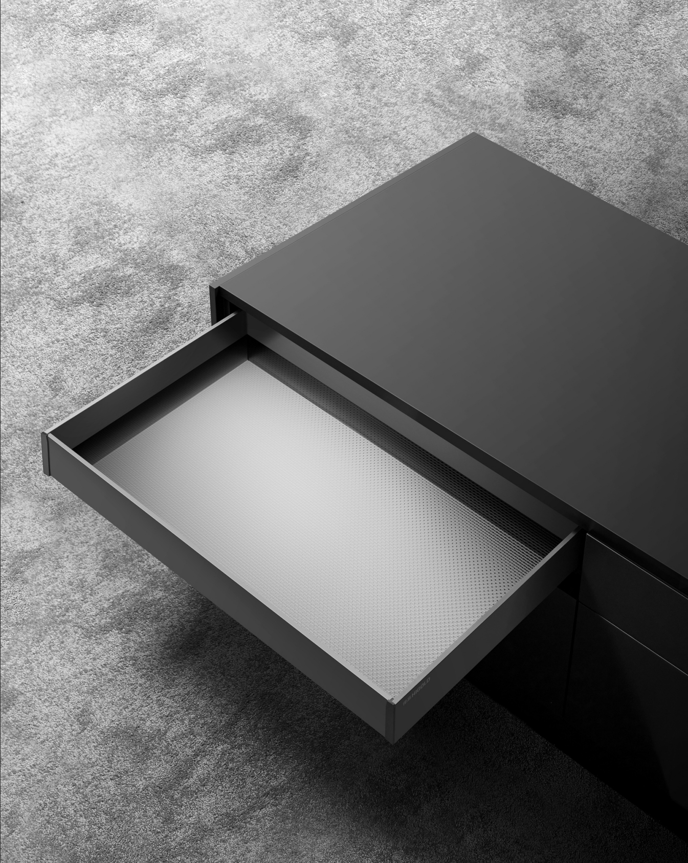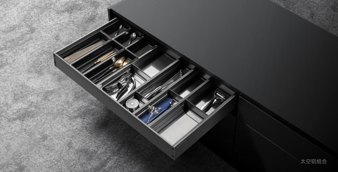 Ngăn kéo đựng đồ 4 mặt Higold | Series JR được làm từ nhôm hàng không phủ Nano xám giúp chống ăn mòn, dễ vệ sinh. Đáy được xi mạ điện 3 lớp phủ PVD mang đến vẻ sang trọng, bền bỉ theo thời gian.